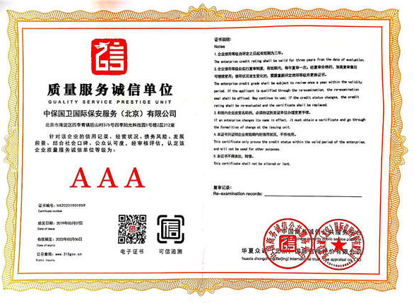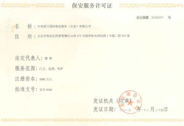 中保國衛(wèi)國際保安服務(北京)有限公司,屬中保國衛(wèi)集團旗下子公司。能全方位的為大型客戶提供優(yōu)質(zhì)的安保、押運服務,是集人防和技防于一體的新型正規(guī)化綜合安保押運服務企業(yè),提供人防、物防、技防、聯(lián)網(wǎng)報*、非武裝押運等安防相關的一站式服務。 公司在國內(nèi)多省設立有分公司及分支機構(gòu),著重提升安全押運、智能技術押運及安全技術防范相關的服務,業(yè)務范圍覆蓋全國一、二線城市、港澳地區(qū)以及海外地區(qū)。安保方面主要為政府機構(gòu)、金融機構(gòu)、企事業(yè)單位、醫(yī)療衛(wèi)生、高等院校、工業(yè)園區(qū)、大型商場、高檔住宅、智能商務樓、大型活動提供門衛(wèi)、守護、巡邏、押運(非武裝)、安全檢查、保安特勤、私人護衛(wèi)、消防中控、安全技術防范、遠洋護航等全方位服務,同時面向國際市場,為中資企業(yè)在“一帶一路”沿線國家投資提供境外安保服務。 >> 更多內(nèi)容 |